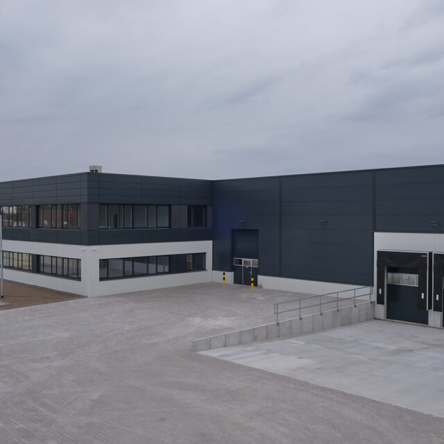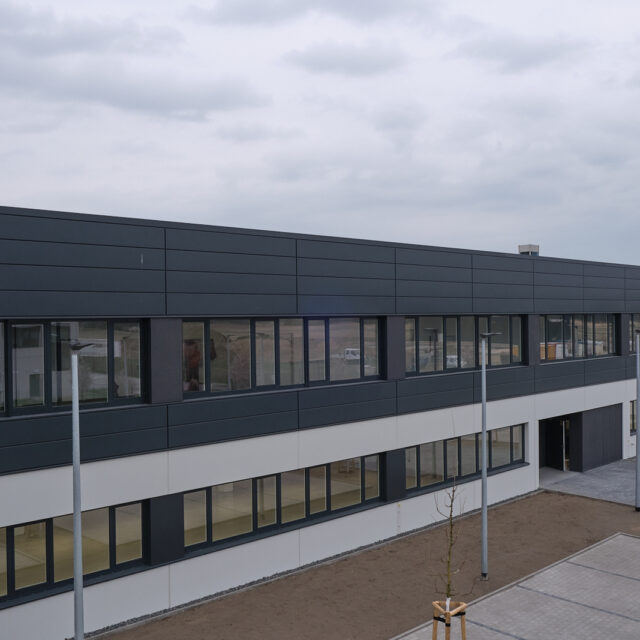 • Büro mit Betonsandwichfassade im EG und Fassaden-Sidings in Aluminium im OG, Halle mit Isopaneelfassade